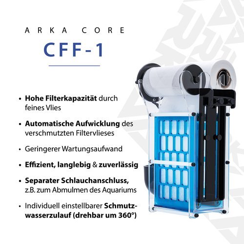 Der ARKA® Core Vliesfilter „CFF-1“ ist ein speziell entwickelter automatischer Feinfilter für alle Meer- und Süßwasseraquarien. Mit der integrierten, feinen Vliesrolle filtert der ARKA® Core Vliesfilter „CFF-1“ organische Verschmutzungen aus dem Wasser und entfernt diese nachhaltig aus dem Aquarium, bevor sich diese zersetzen können.