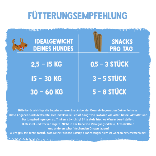 Bitte berücksichtigen Sie die Zugabe von Snacks bei der Gesamt-Tagesration Ihres Hundes.