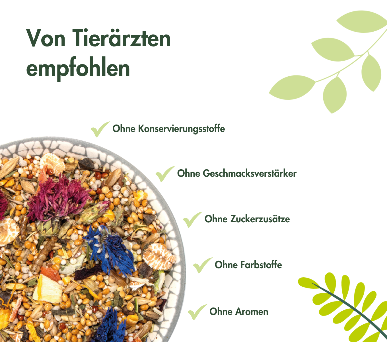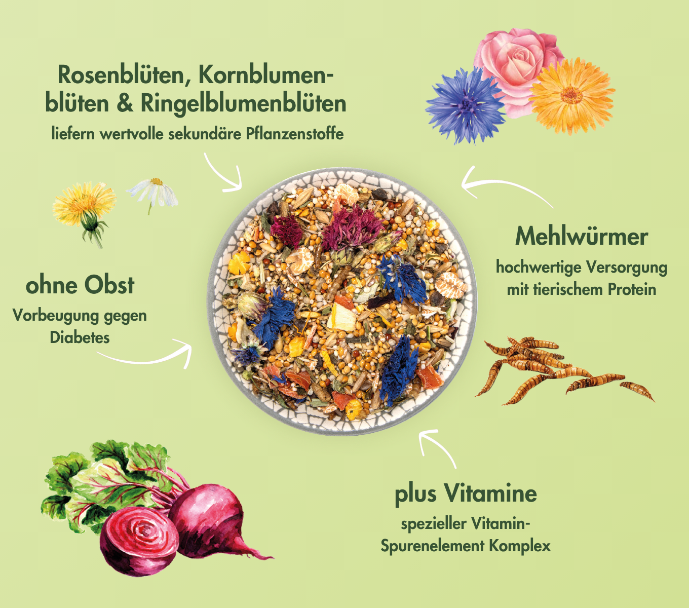Plata Hirse, Erbsenflocken, Mungobohnen, Quinoasamen (6%), Weiße Hirse, Haferkerne, Amaranth gepufft (4%), Rote Hirse, Dinkelflocken, Süßlupinenflocken, Buchweizen, Gerste, Leinsamen, Karotten, Perillasamen, Sesam, Kamut®, Grassamen, Pastinaken, Mehlwürmer (1,5%), Löwenzahnblätter, Luzerne, Schafgarbe, Spitzwegerich, Rote Bete, Calciumcarbonat, Kamillenblüten, Ringelblumenblüten (0,4%), rote Kornblumenblüten (0,3%), blaue Kornblumenblüten (0,3%), Rosenblüten (0,1%), Weizengrießkleie (Blüten 1,5%)