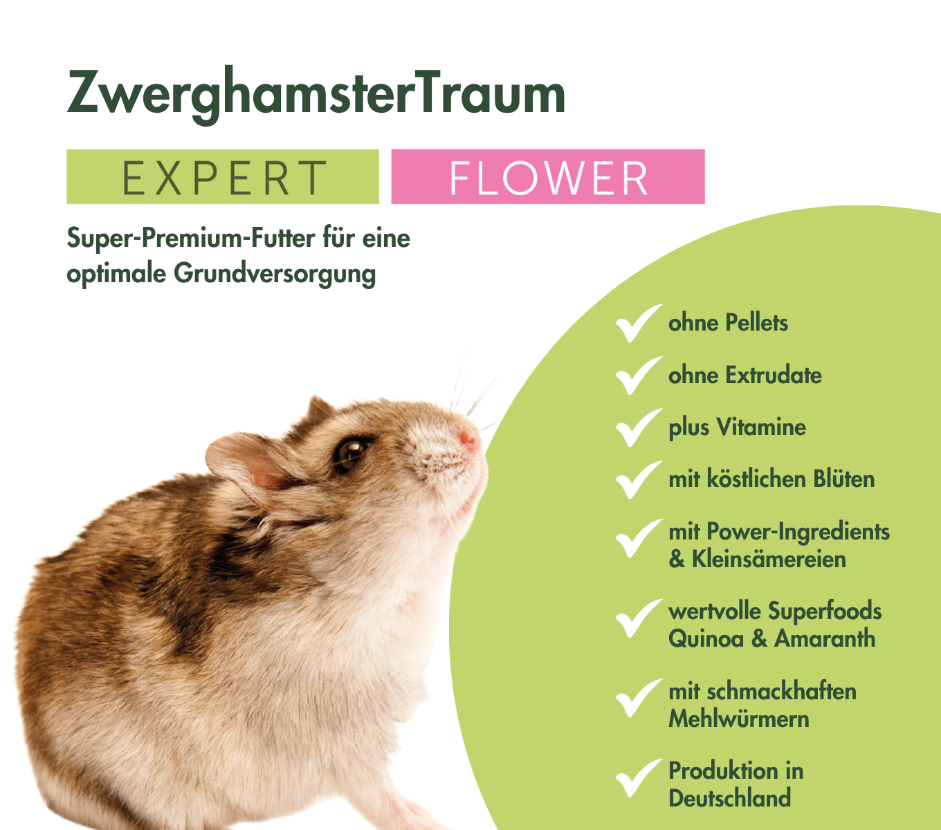 ZwerghamsterTraum EXPERT FLOWER ist so ausgewogen, dass es zur freien Verfügung (ad lib) gefüttert