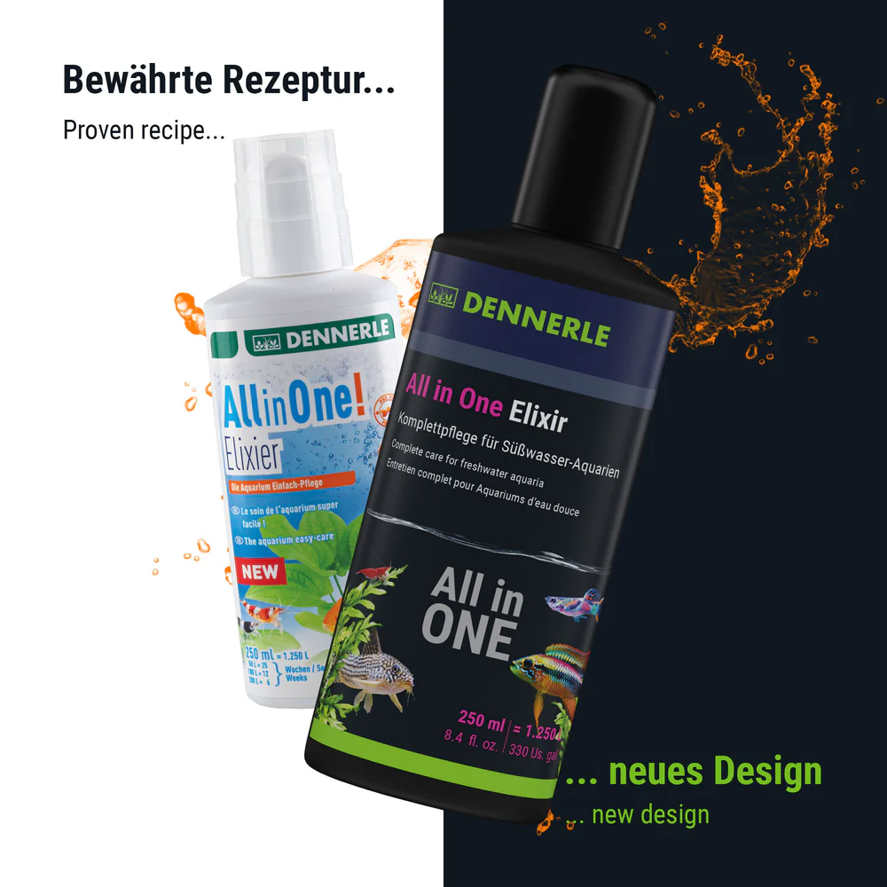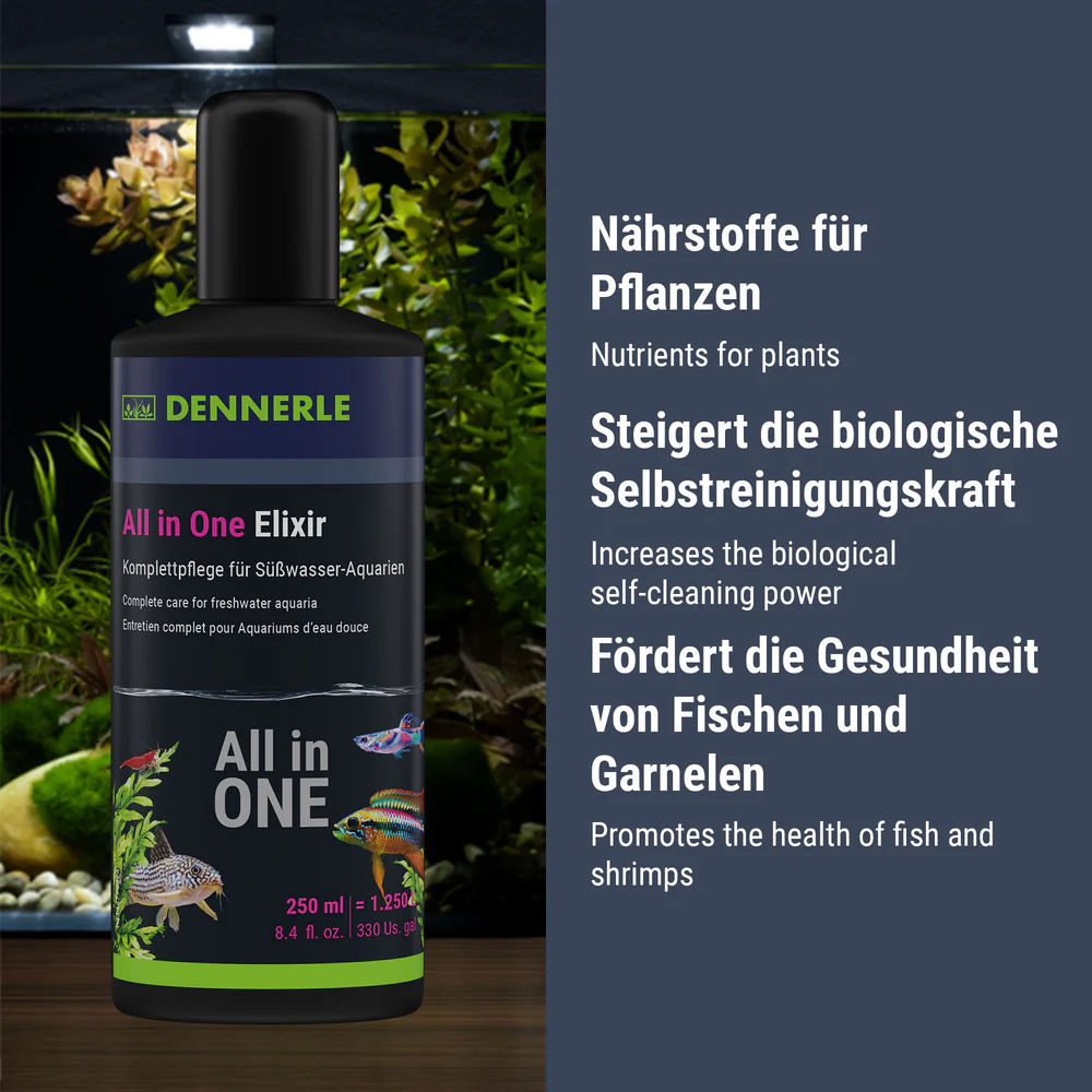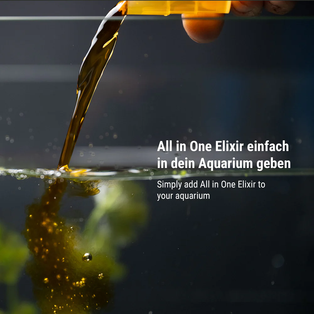 Ist die neue und umfassende Einfach-Pflege für ein schönes Aquarium, in dem sich Fische, Garnelen und Pflanzen wohl fühlen. Ideal für den problemlosen Einstieg in das wohl schönste Hobby der Welt. All in One Elixir ist Wasser-, Fisch-, Garnelen-, Filter-, Pflanzenpflege sowie Kohlenstoffversorgung in einem und hat 12 aufeinander abgestimmte Wirkkomplexe. Supereinfach in der Anwendung sorgt es für sichtbaren Erfolg schon nach wenigen Wochen. Einfach einmal in der Woche 20 ml auf 100 Liter Aquariumwasser dosieren und Ihr Aquarium ist in Balance.